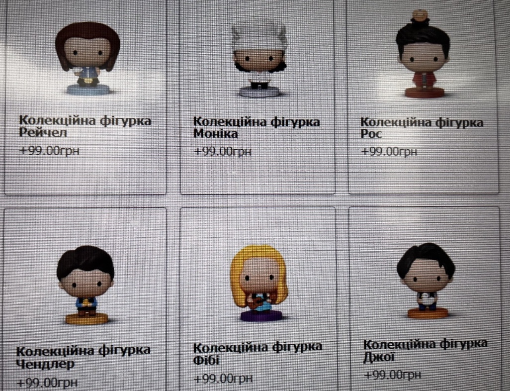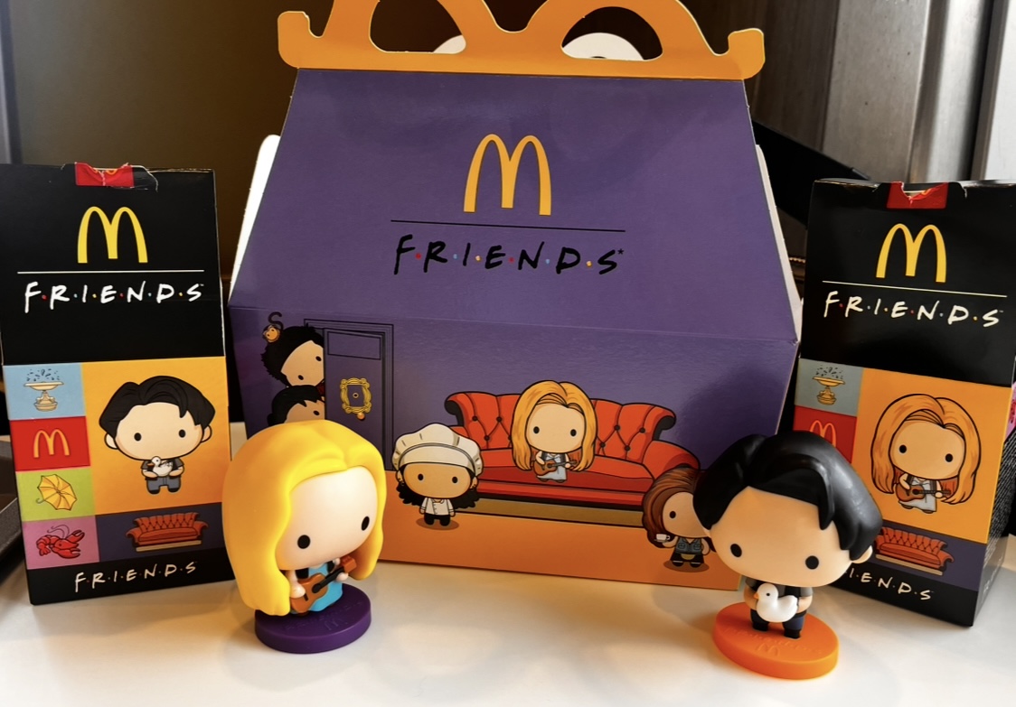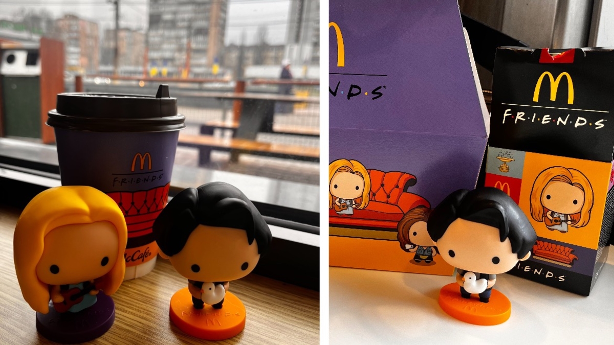 Для фанатів серіалу «Друзі» МакДональдз запустив продаж фігурок із зображенням персонажів. Купити фігурку Моніки, Рейчел. Джої, Чендлера і Фібі. Вони входять до набору «дорослого хеппі міл».