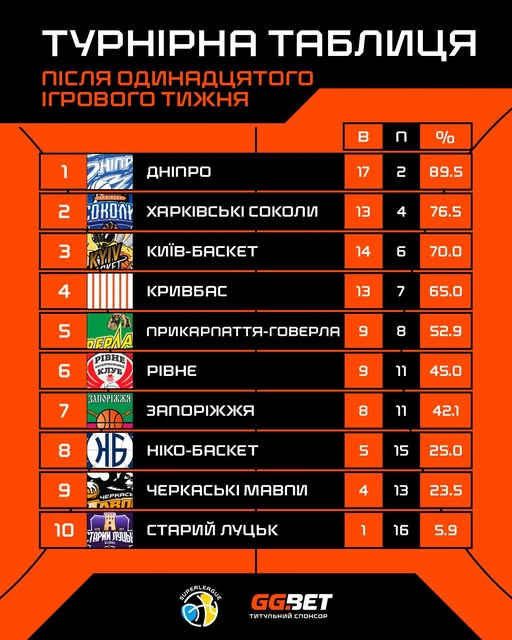 Турнірна таблиця, де БК “Кривбас” посідає 4-ту сходинку