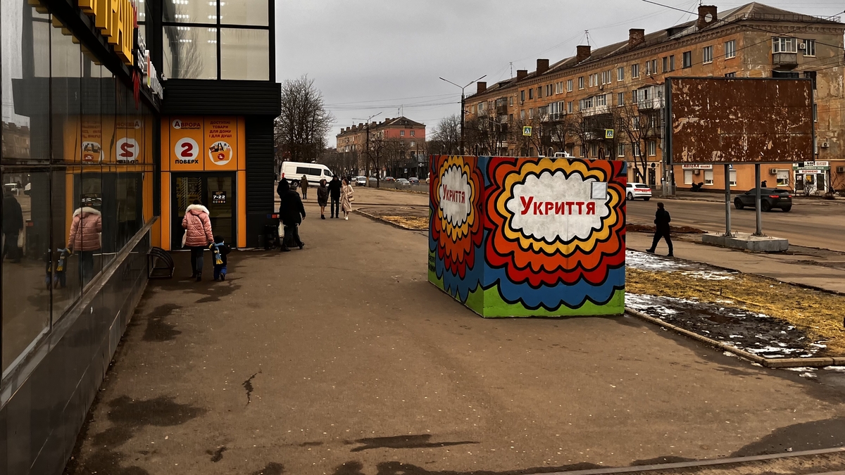 Укриття видно здалеку, адже воно розфарбоване у яскраві кольори і знаходиться у місці великого потоку людей.