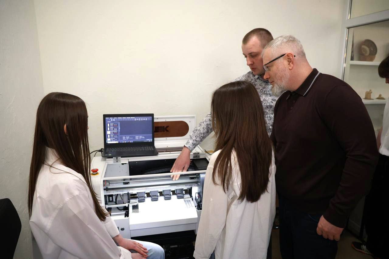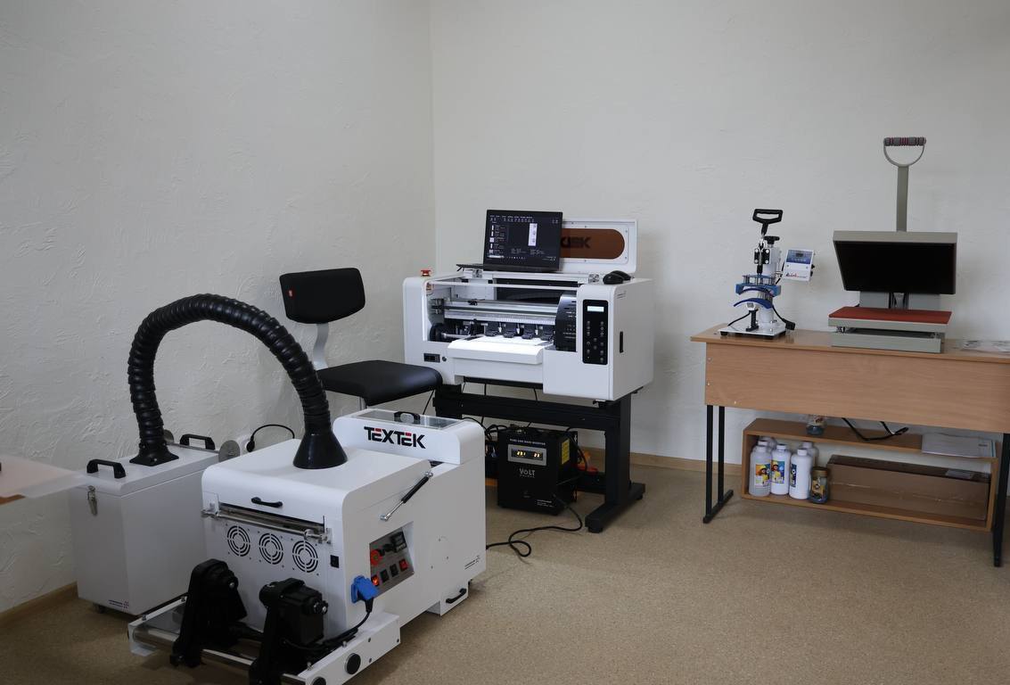 1. Цифрове виробництво (3D-моделювання та DTF-друк): Учні опановують повний цикл створення продукту — від сканування реальних об’єктів за допомогою сучасного 3D-сканера до розробки моделей у TinkerCAD та Blender. Встановлені 3D-принтери дозволяють миттєво прототипувати ідеї, а потужний друкарський DTF-комплекс разом із термопресами дає змогу створювати професійний мерч та авторські принти на тканині. (Довідково: DTF-друк (Direct-to-Film) — це інноваційна технологія нанесення зображень, при якій принтер друкує малюнок на спеціальній плівці, що потім покривається клеєм і переноситься термопресом на тканину).