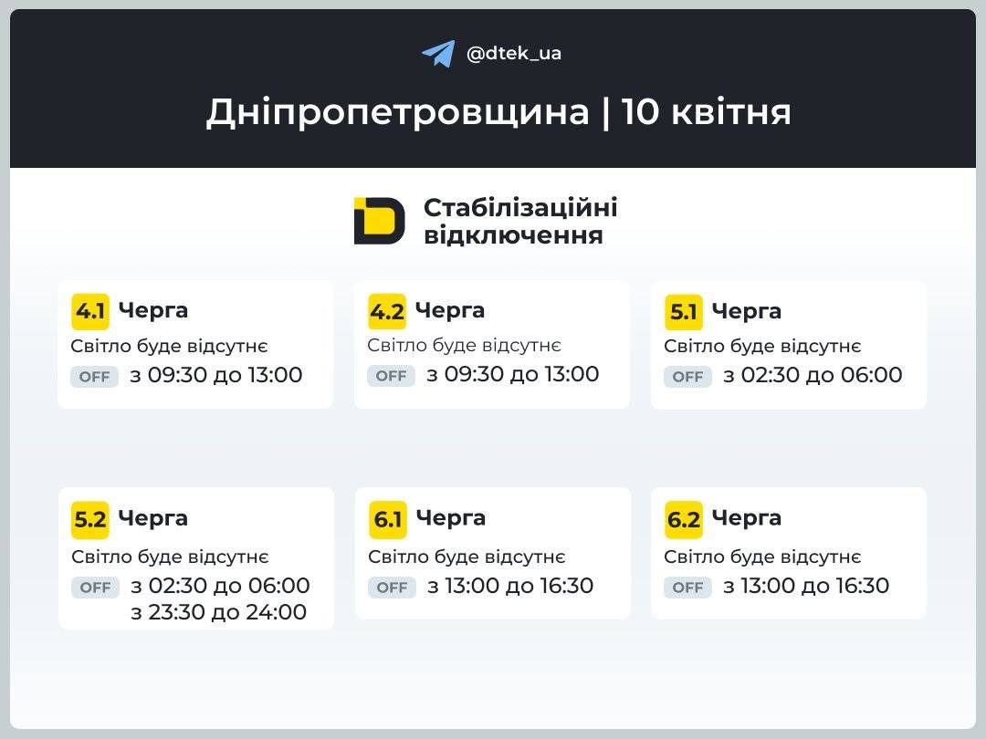 У ДТЕК опублікували графіки стабілізаційних відключень для Дніпропетровської області на пʼятницю, 10 квітня: